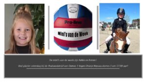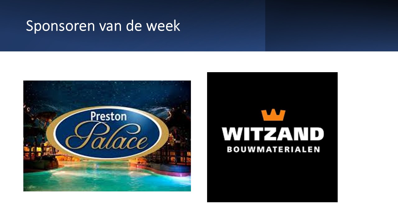 Onze sponsoren van de week zijn deze week: Witzand en Preston Palace. Onze mini’s van de week zijn deze week Ankie en Femm. Morgen zijn zij aanwezig bij de wedstrijd van dames 1 tegen Oranje Nassau, om 17u in de Haambrink.